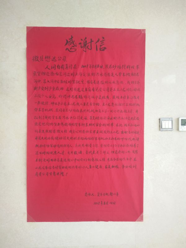 趙小平說:“8月8日中午,我駕駛貨車途徑柳林白崖河,由于突降暴雨、河水猛漲,洪水將我連人帶車掀翻至河中,我被困在駕駛室,當(dāng)時(shí)生命和財(cái)產(chǎn)受到了嚴(yán)重威脅。這時(shí),貴公司王小龍立即向我伸出援手,在第一時(shí)間組織工地挖機(jī)、鏟車等機(jī)械,連同岳克斌、岳涵、陳興銀等員工一起,順利將我救上岸,并及時(shí)控制了我的貨車沒有陷的更深。在此我表示深深地謝意,感謝貴公司為社會(huì)培養(yǎng)這么好的優(yōu)秀人才,愿幫助我的幾位好心人身體健康、家庭和睦、事業(yè)順利,愿貴公司生意興隆。”