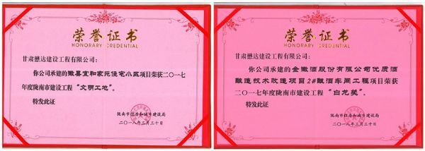3月30日召開的隴南市2018年建設工程安全質量監(jiān)管工作會議上,公司承建的金徽酒股份有限公司優(yōu)質酒釀造技術改造項目2#釀酒車間工程項目榮獲2017年度隴南市建設工程“白龍獎”,同時徽縣宜和家苑住宅小區(qū)項目榮獲2017年度隴南市建設工程“文明工地”。