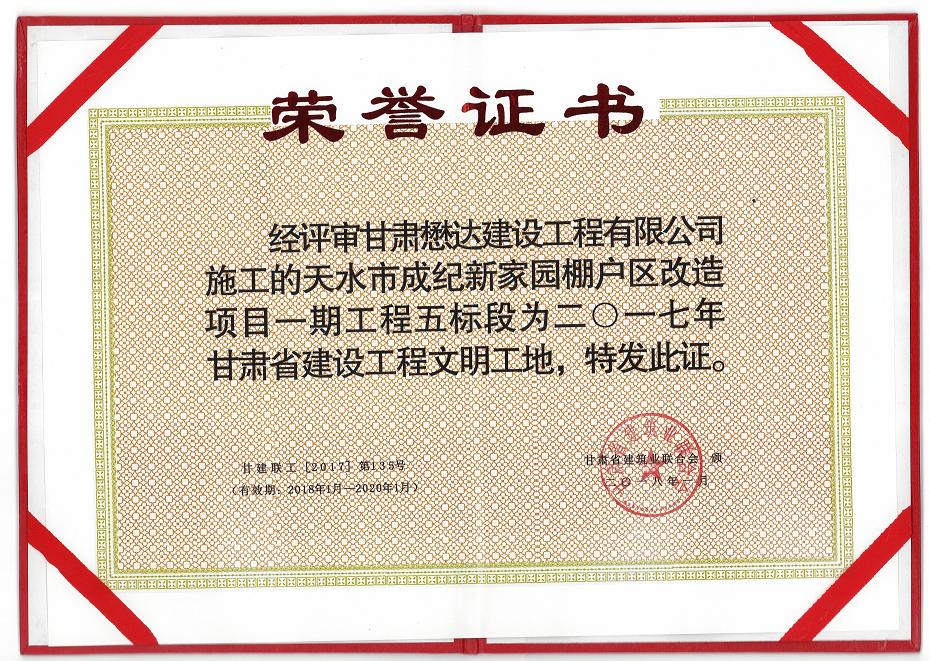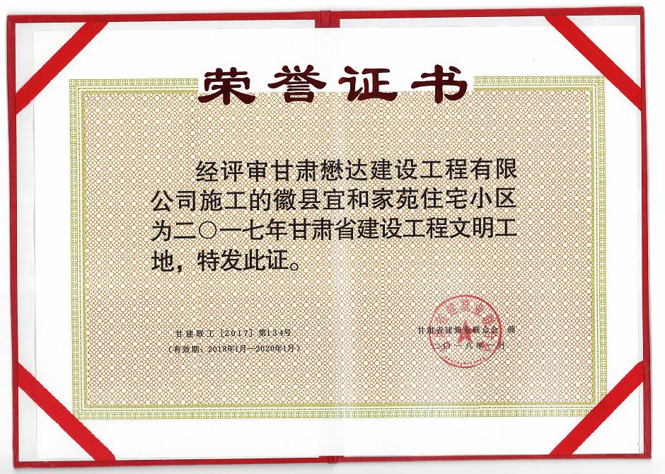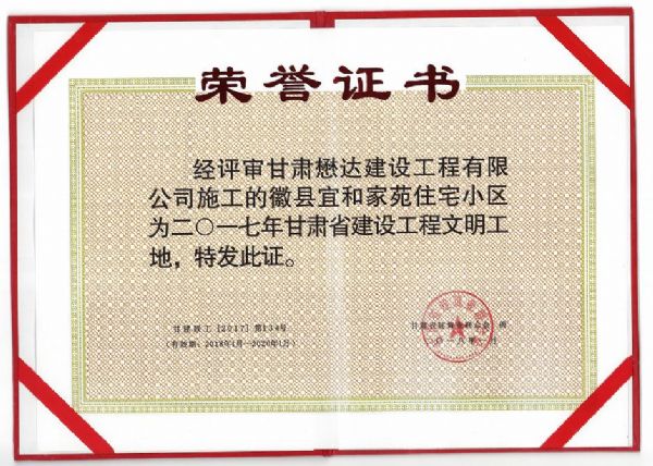 日前,由甘肅懋達建設工程有限公司承建的徽縣宜和家苑住宅小區項目、天水市成紀新家園棚戶區改造項目一期工程五標段項目在2017年全省建筑業“三優一文明”評選中喜獲“2017年甘肅省建設工程文明工地”榮譽稱號。