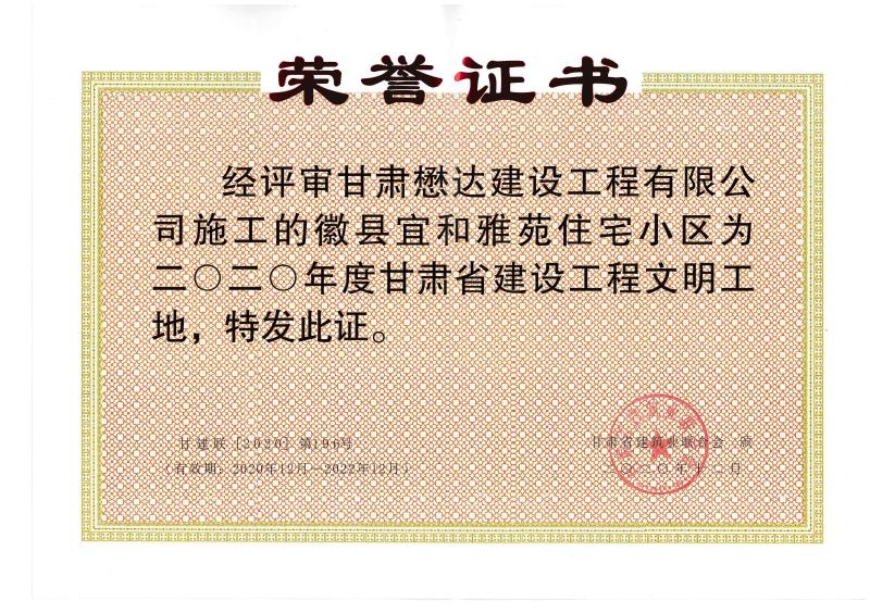 近日,公司承建的徽縣宜和雅苑項(xiàng)目被甘肅省建筑業(yè)聯(lián)合會(huì)表彰為2020年度甘肅省建設(shè)工程文明工地榮譽(yù)稱號(hào)。