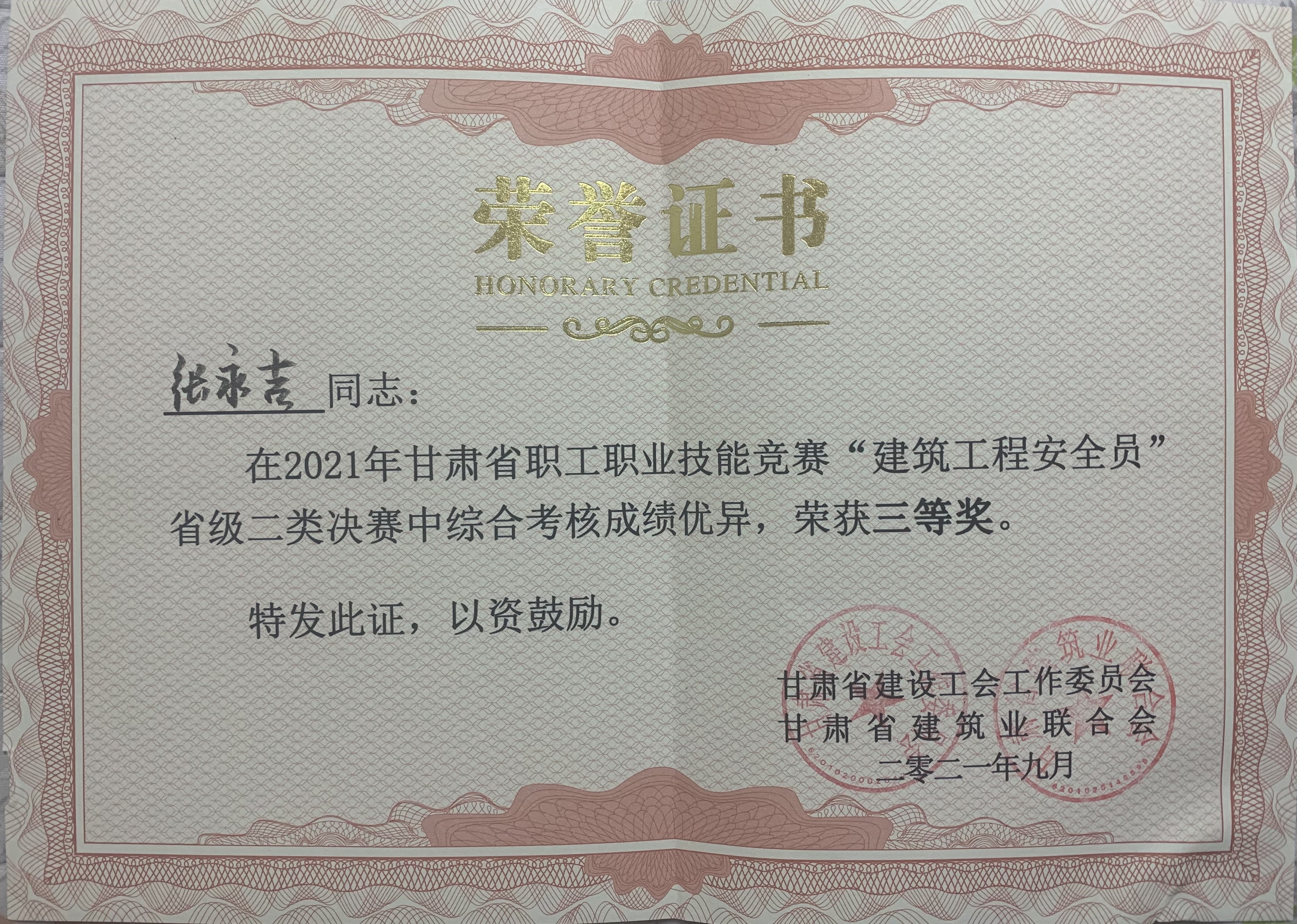 競賽依據建筑行業相關安全法律法規及標準規范,由理論知識考試和實際操作考核兩個模塊組成,來自全省的25個代表隊的50名安全員參加了此次競賽活動。經過一天的激烈角逐,張永吉排名全省第十,榮獲甘肅省職工職業技能競賽“建筑工程安全員”省級二類決賽三等獎;張宏明榮獲優秀選手榮譽稱號。