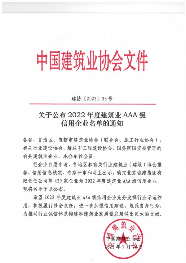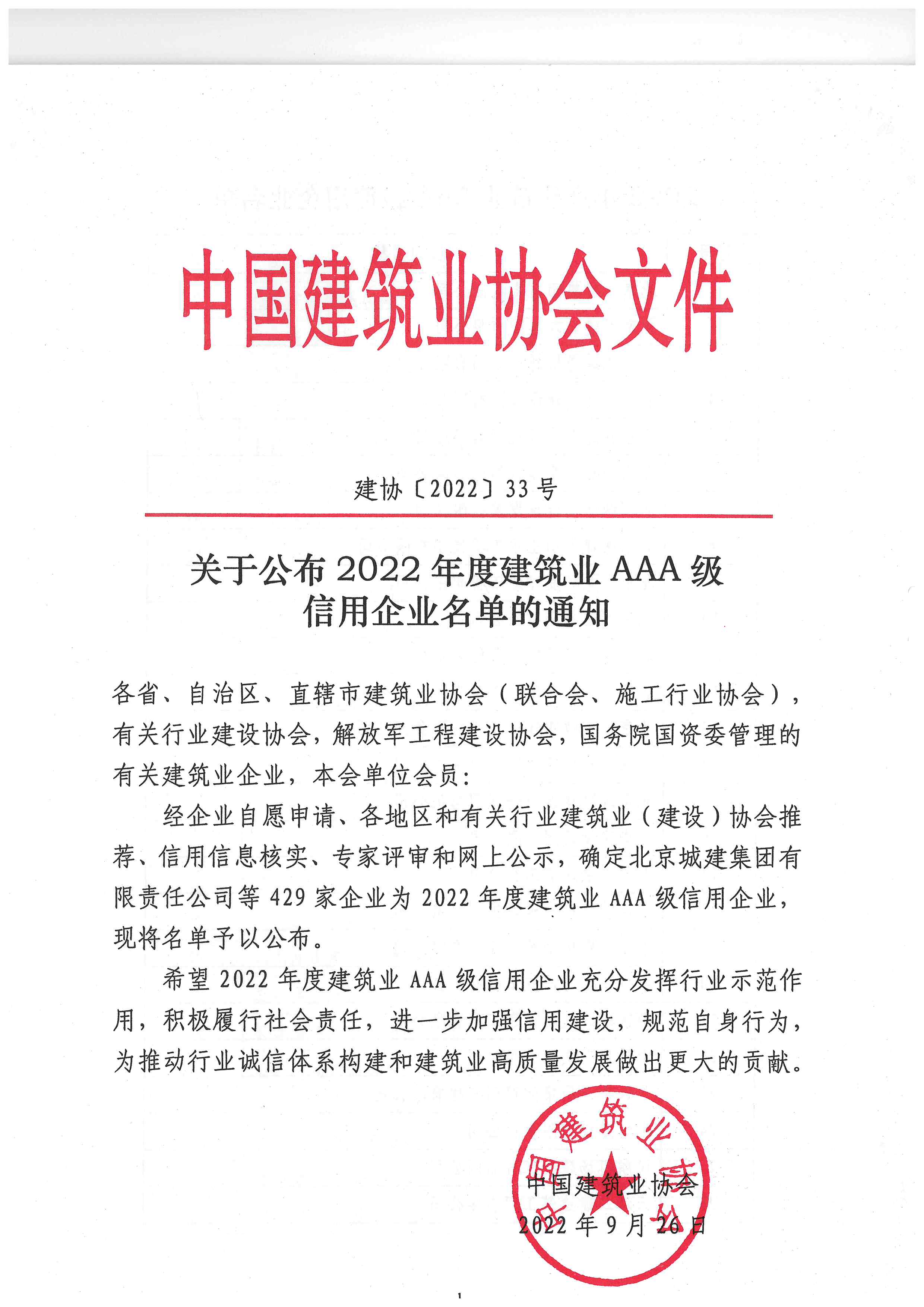 近日,從中國建筑業協會傳來捷報,公司獲評2022年度“建筑業AAA級信用企業”。