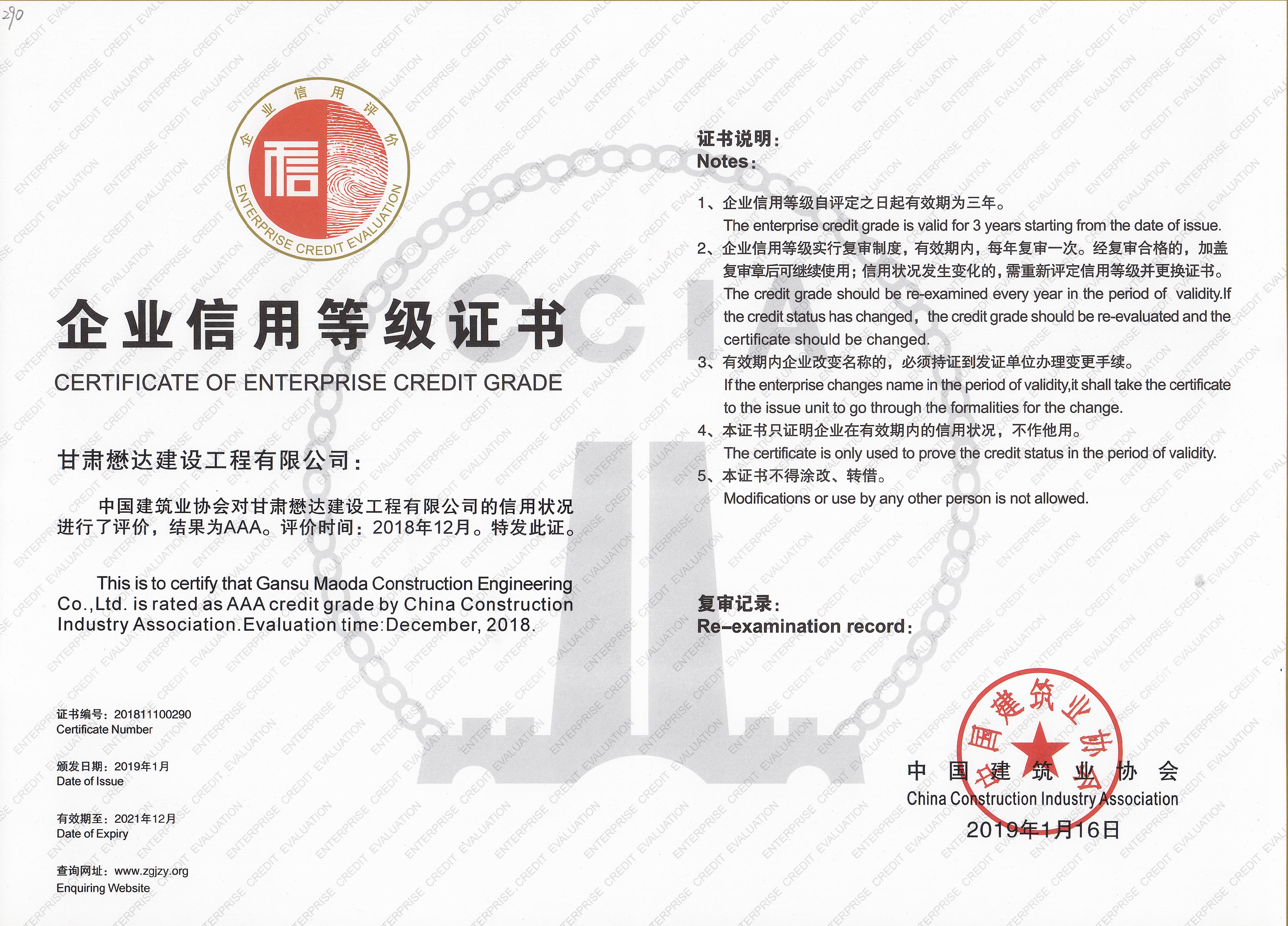 建筑業企業信用評價由中國建筑業協會組織評定,旨在認真貫徹落實國家信用體系建設要求,加快推動建筑行業社會信用體系建設,提高企業誠信意識和信用水平。評價結果分為AAA、AA、A、B、C五個等級。“建筑業AAA級信用企業”是全國建筑業企業綜合能力最高評價,是通過對企業基本素質、經營能力、財務指標、管理能力及競爭力等五個方面指標綜合考核而最終審定的建筑行業誠信經營的標桿企業。
