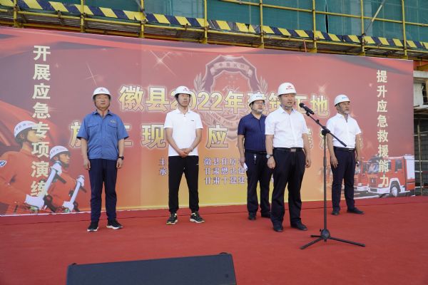 為應對建筑施工地現場突發安全事故,進一步提高公司處理建筑工地安全生產事故的能力2022年6月30日由徽縣住房和城鄉建設局主辦,甘肅懋達建設工程有限公司、甘肅十建建設工程有限公司承辦的“徽縣2022年建筑工地施工現場應急預案演練”活動在徽縣膠州中學項目一期一標段舉行。縣住建李亞軍副局長、縣防汛抗旱指揮隊王亞輝隊長、質安站荔秀平懋達實業集團副總經理尹向宏、總工程師朱金平等相關領導出席并參加了本次演練活動。