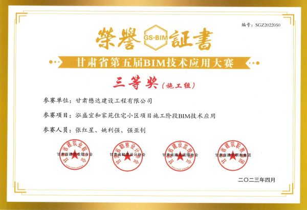 近日,從甘肅省建筑業數字化轉型峰會暨2022年甘肅省第五屆BIM技術應用大賽傳來喜訊,由公司BIM小組申報的泓盛宜和家苑住宅小區項目施工階段BIM技術應用榮獲大賽施工組三等獎。