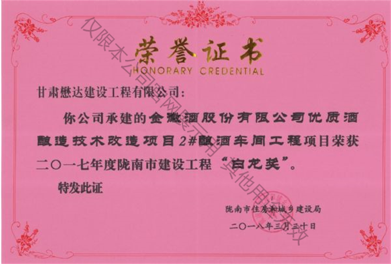 金徽酒股份有限公司優質酒釀造技術改造項目2#釀酒車間工程--2017年度隴南市白龍獎