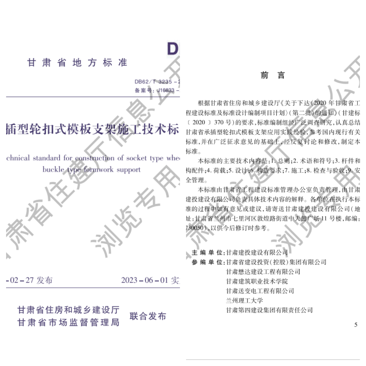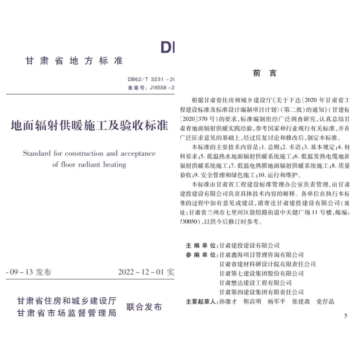 甘肅省住房和城鄉建設廳、甘肅省市場監督管理局于近日發布公告,由公司參編的甘肅省地方標準《地面輻射供暖施工及驗收標準》DB62/T 3231-2022 和《承插型輪扣式模板支架施工技術標準》DB62/T 3235-2023正式發布,分別于2022年12月1日和2023年6月1日起實施。